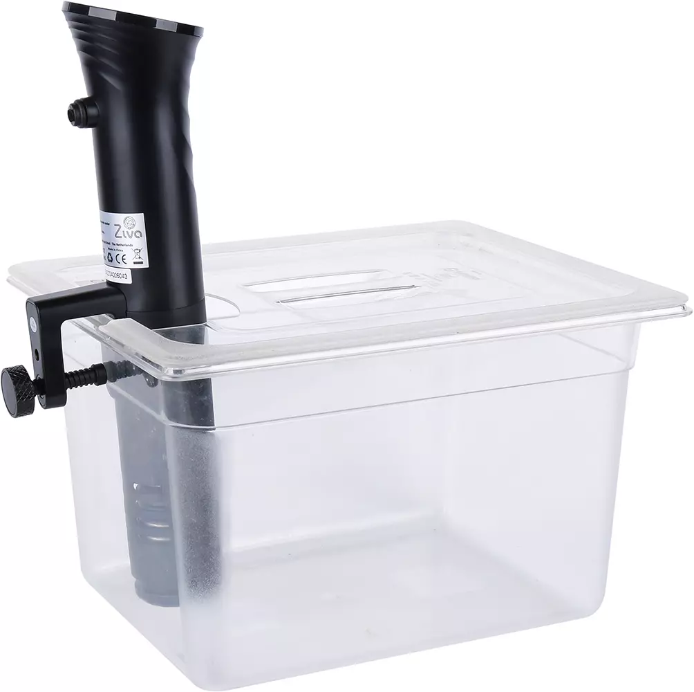Sous-Vide-Experten empfehlen unzerbrechliche, durchsichtige Behälter aus Polycarbonat zur Verwendung mit unseren Sous-Vide-Controllern. Das Material weicht durch das heiße Wasser nicht auf und die Außenseite wird nicht so heiß wie bei einem (Suppen-)Topf aus Stahl. Darüber hinaus dient es auch als Sous-Vide-Aufbewahrungsbox.\