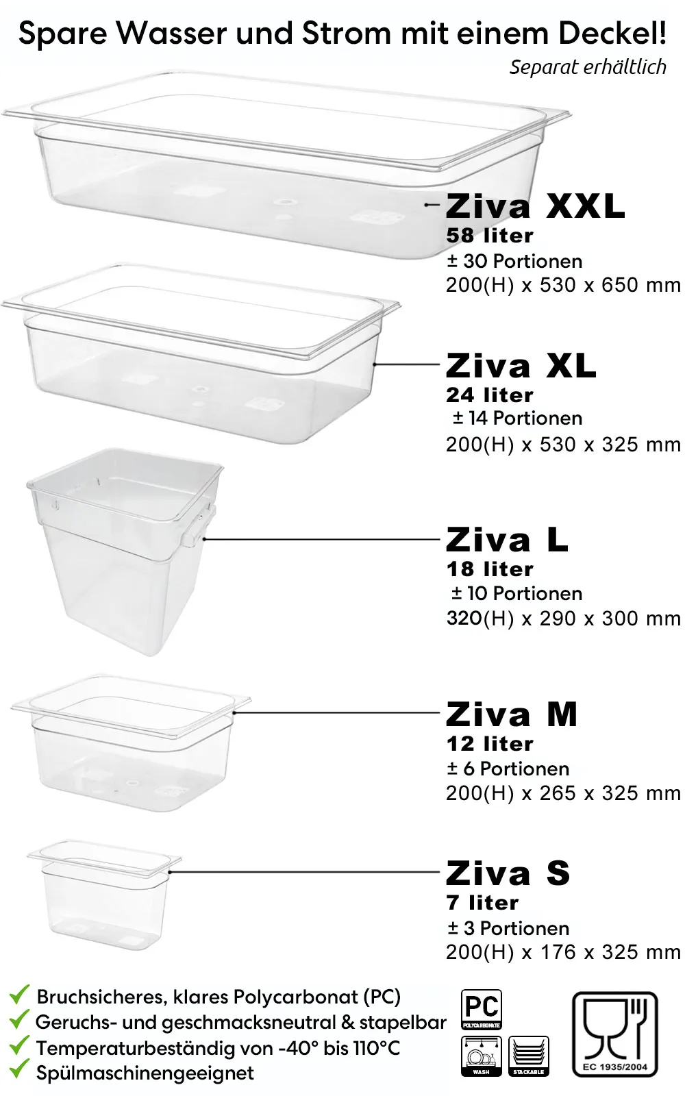 - Ziva Sous-Vide-Wassertank Groß (18 Liter) – Robuster, hitzebeständiger Wasserbehälter für präzises Sous-Vide-Garen.