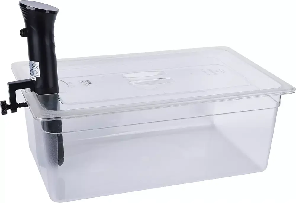 Die hochwertigen Gastronorm-Sous-Vide-Behälter sind bis 110 °C hitzebeständig und verfügen über eine Deckelaussparung, die für Sous-Vide-Sticks mit einem Heizrohrdurchmesser von bis zu 65 mm geeignet ist. Dies macht den Behälter besonders sicher und zuverlässig, selbst in Haushalten mit Kindern.