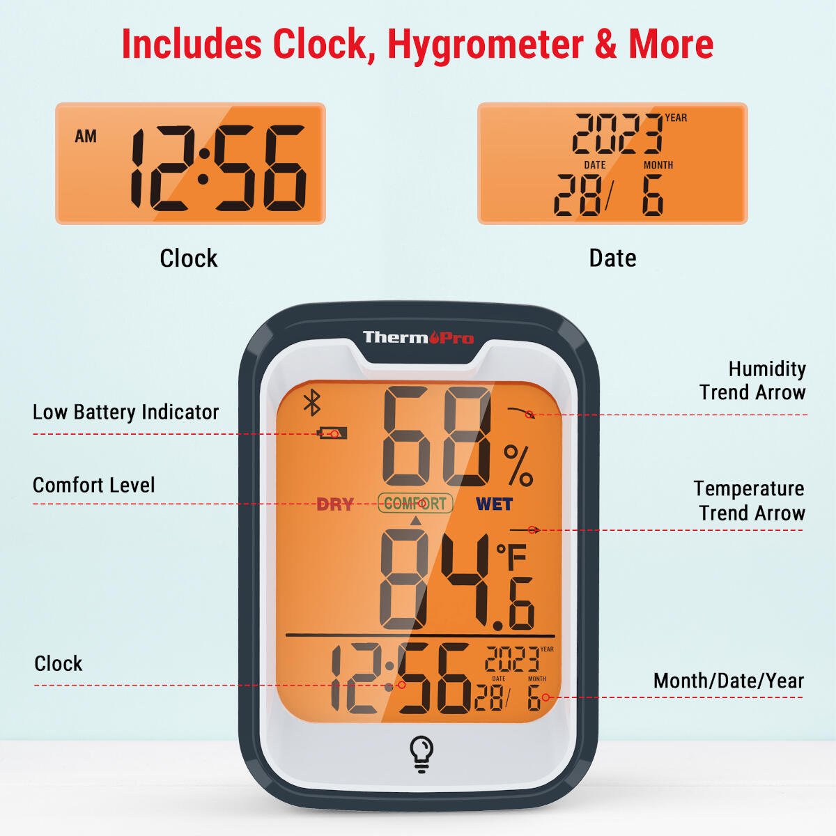 - All-in-One-Display: Komfortsymbol, Trendpfeile, Uhr und großer Bildschirm mit Hintergrundbeleuchtung – wissen Sie sofort, ob die Luft trocken, ideal oder feucht ist :contentReference[oaicite:4]{index=4}.