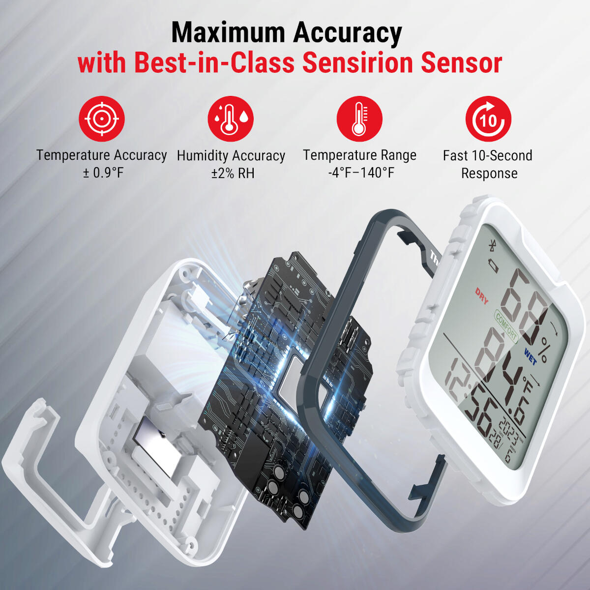 - Aufschlussreiche App-Funktionen: Stellen Sie Ihre idealen Temperatur-/Feuchtigkeitszonen ein, erhalten Sie sofortige Benachrichtigungen, zeigen Sie historische Trends an und exportieren Sie bis zu zwei Jahre Daten :contentReference[oaicite:3]{index=3}.