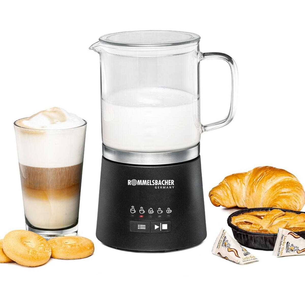 Rommelsbacher MS 625 – Elektrischer Milchaufschäumer – 600 W Leistung – 5 Programme – Abnehmbarer Glaskrug – Heißer & kalter Milchschaum – 250 ml Aufschäum- / 500 ml Fassungsvermögen