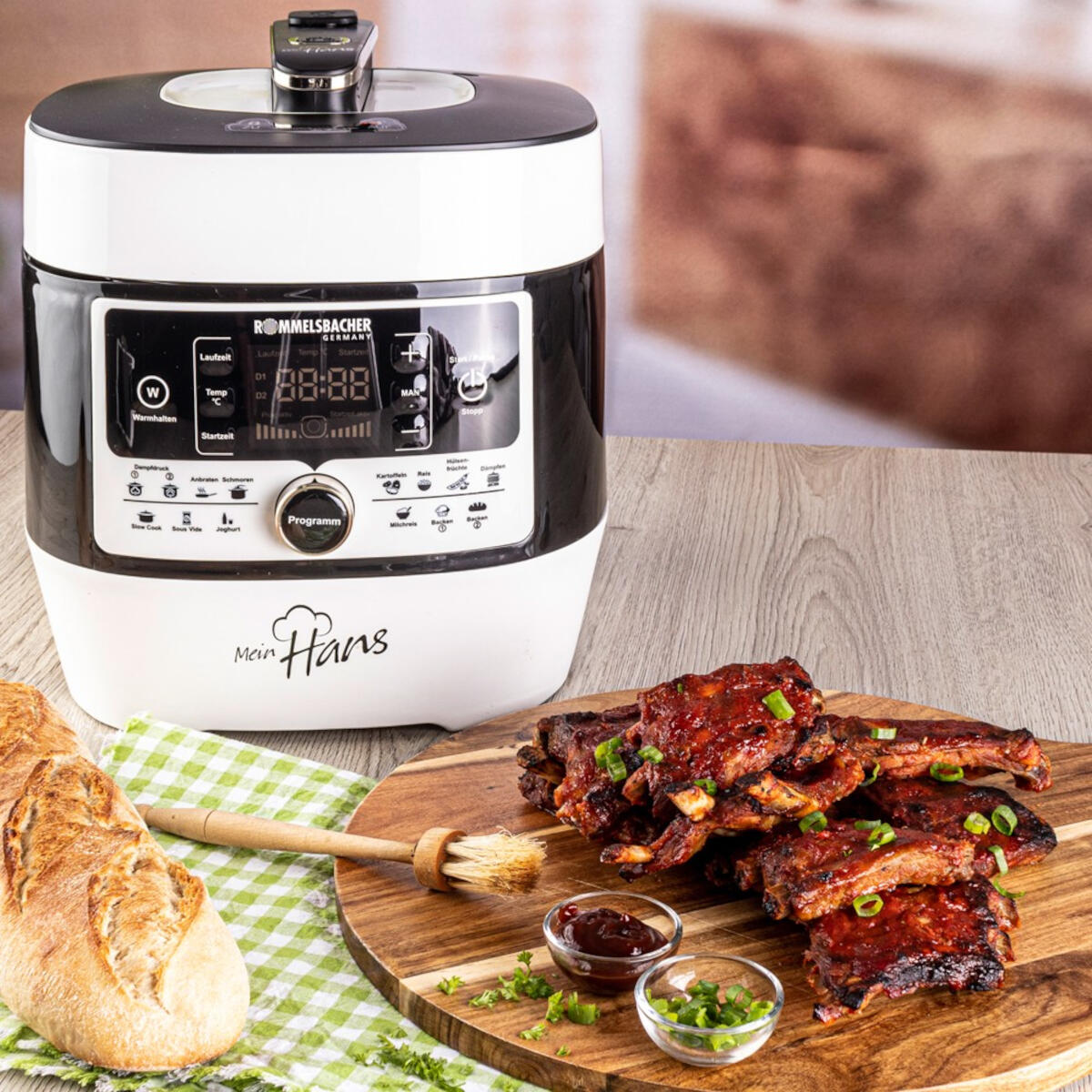 Der ROMMELSBACHER MD 1000 „Mein Hans“ Multi-Schnellkochtopf ist der ultimative multifunktionale Küchenhelfer und bringt gesundes, fettarmes Kochen in Ihr modernes Zuhause. Mit seinen 14 automatischen Kochprogrammen, inklusive manueller Einstellungen, und flexiblen Temperaturbereichen von 40 °C bis 170 °C ist er Ihr perfekter Partner für die einfache Zubereitung von Gemüse, Fleisch, Suppen, Eintopfgerichten, Joghurt und sogar Desserts. Ob Schnellkochtopf, Slow Cooker oder Dampfgarer – „Mein Hans“ bietet Ihnen eine Komplettlösung, die Ihren Kochalltag vereinfacht und gleichzeitig Zeit und Energie spart.