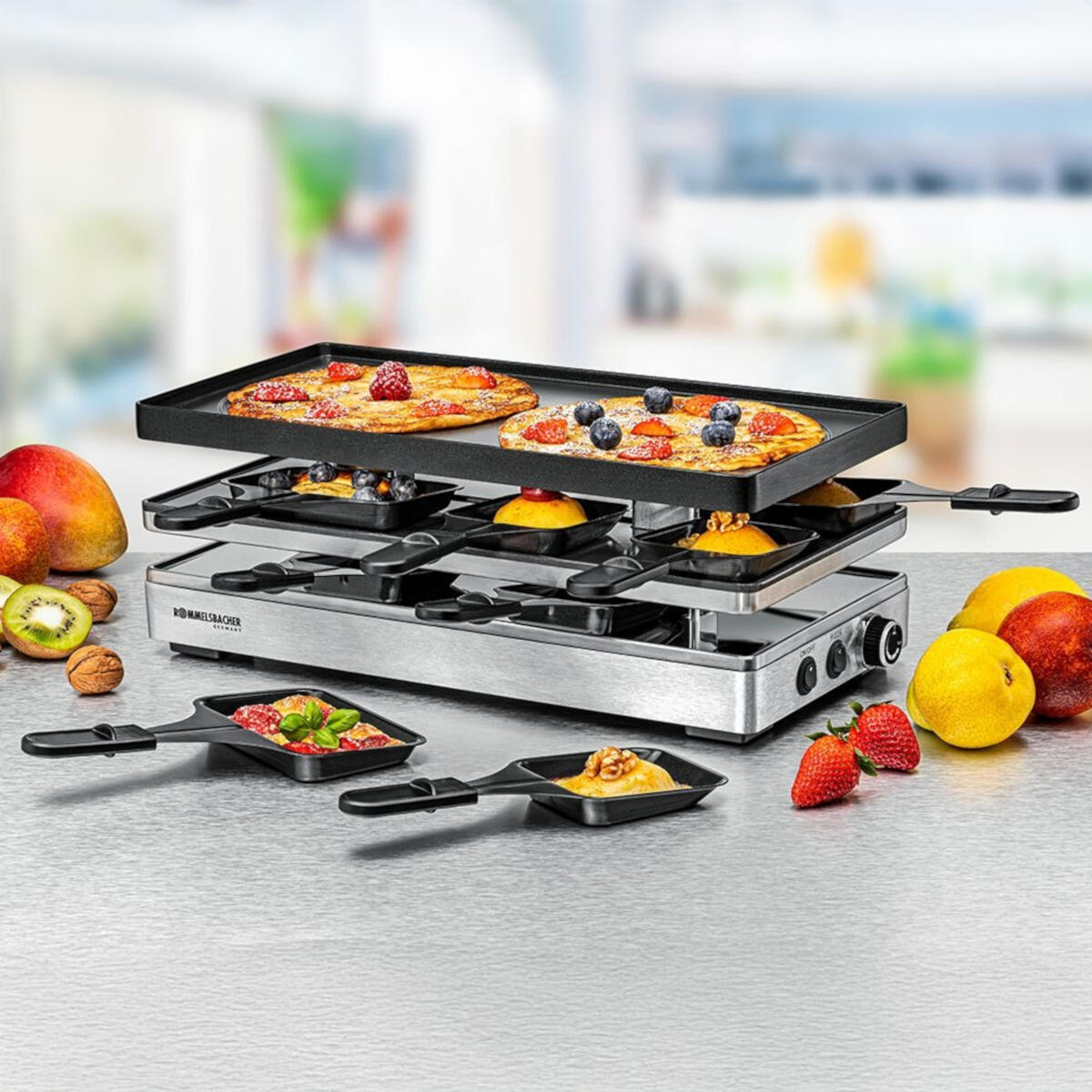 Rommelsbacher RCP 1800 – Pizza-Raclette – Wendbare Aluminiumgussplatte – 8 Raclette-Pfannen + 6 XXL-Pizza-Pfannen – Keramische Antihaftbeschichtung, PFAS-frei – 1800 W